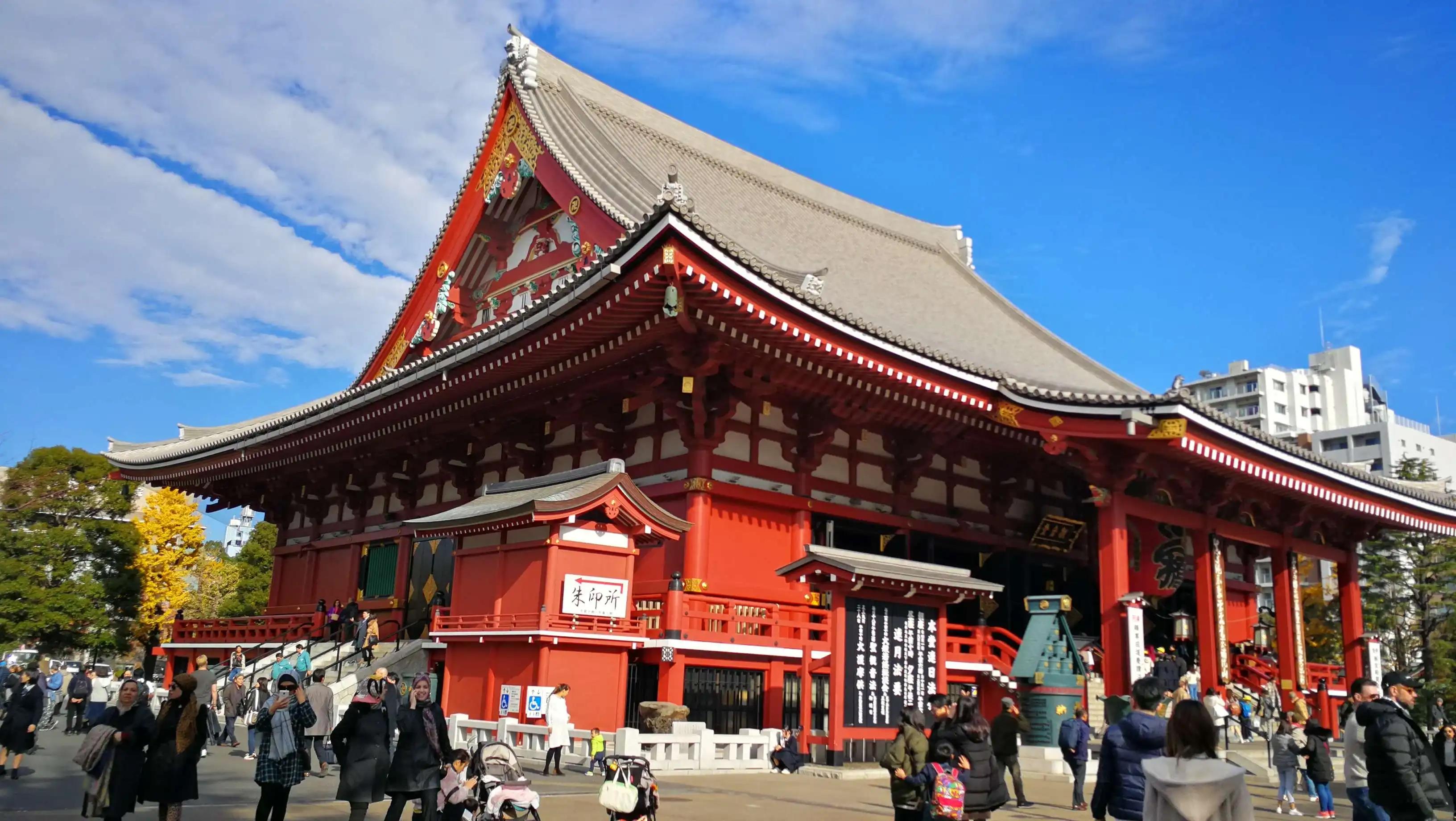浅草是东京的发源地。浅草寺是东京最古老的寺庙。也叫浅草雷门观音寺,该寺正式名称为金龙山浅草寺。在门的中央有一下垂的巨大灯笼,上面写着“雷门”二字,已成为浅草的象征。据传公元628年,一对以捕鱼为生的兄弟在隅田川中发现了观音像,认为是“观音显灵”。于是,人们在当地修建寺院,供奉观音。